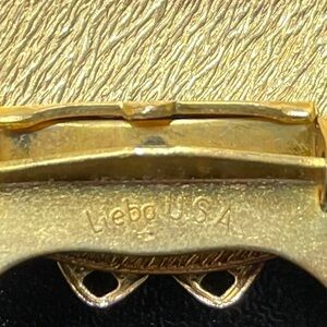 The style of Lieba clips ranged from the heraldic, Victorian to Art Nouveau, modernist, abstract and brutalist. Also, the designs included textured or filigree, floral, geometric and classic motifs. The company’s craftsmen created jewelry from metal alloys of gold and silver tones, as well as gold, semi-precious stones, faux pearls, rhinestones and art glass. The markings on the back of each item included “Lieba U.S.A.”
