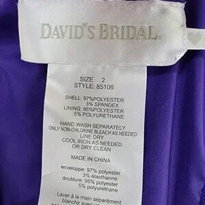The dress is available in size 2 and is perfect for women who want to make a statement at any event. The dress is solid-patterned and has a stretch satin finish that adds to its elegance. The dress is designed by David's Bridal, a trusted brand in the fashion industry, and is made in China. This dress is perfect for formal occasions, including weddings, and is sure to turn heads.