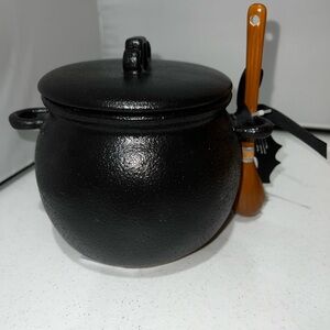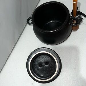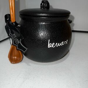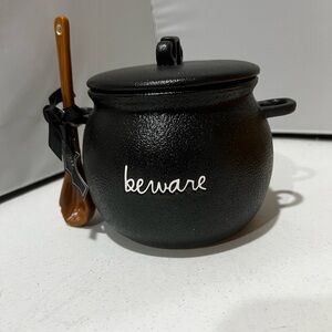New Rae Dunn Beware Cauldron sugar bowl with spoon.