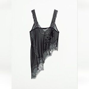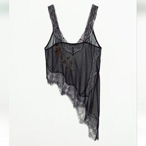 Halter top with sweetheart neckline. Tonal matching soft lace appliqués, floral embroidery, and colorful beading. asymmetric hem.