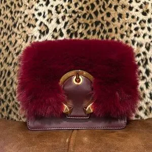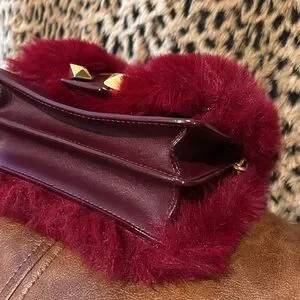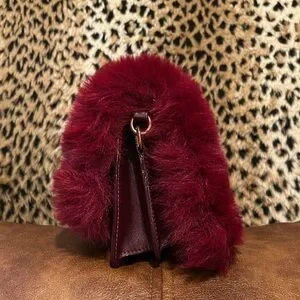 EUC burgundy/merlot faux fur and leather bag with rose gold hardware, adjustable crossbody strap, magnetic flap closure, and accordion body design. Strap is not removable but can be stuffed inside for clutch wear.