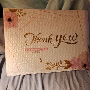8 -8x10 gold "Thank You" printed on the front, the back is filled with pink floral print.