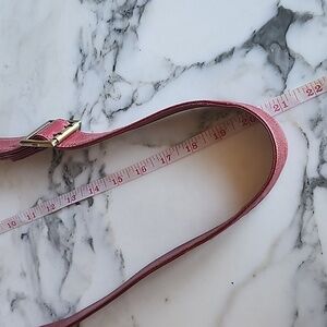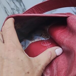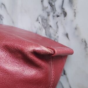 Great preowned condition, this soft red leather purse is in great shape. please review pictures for minor scratches and very minor wear on the edges of the bottom. The interior is in great shape with no staining.
