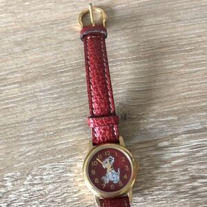 The disney store 101 Dalmatian watch from Disney store fits small wrist meant for kid in south coast plaza mall doesn’t work needs new battery. In great condition has some dirty spots on the inside of strap. See photo