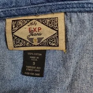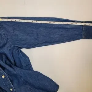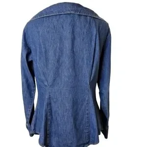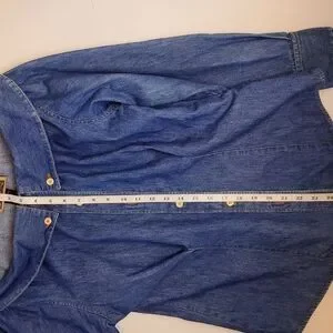 Express vintage long sleeve denim shirt size 9. Heavyweight. Shawl collar. Button front and cuffs. Darts. 100% cotton. Super cute. I wore this once or twice and I was a size Large. In great used condition. Measurements are approximate in flat lay.