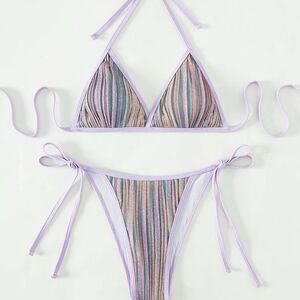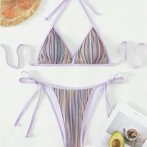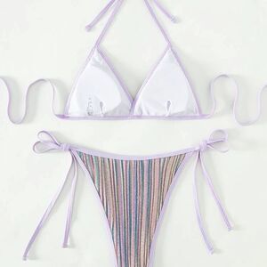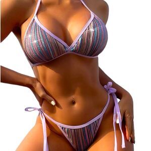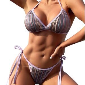 Pastel Mermaidcore Barbiecore Striped Metallic Halter Triangle Bikini