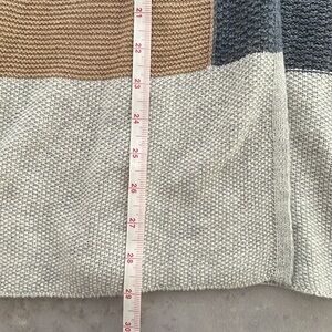 In excellent used condition! Perfect for fall this Lucky Brand open cardigan features a waterfall opening with patchwork “patches” of different textured fabrics in navy, tan and shades of gray. No pockets. Loose and flowy!