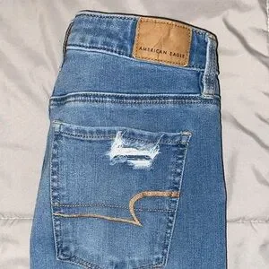 American eagle denim pants I haven’t worn in a while. There is no damage with slight wear to the distressed parts but still intact. Size 2 regular