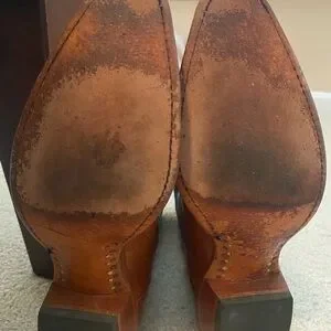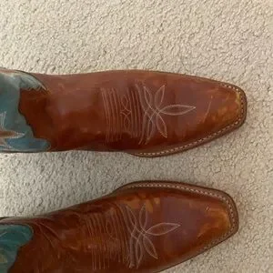 Gorgeous two toned classic cowboy boots. Genuine leather. Gently worn and lots of wear left. There’s some staining on one heel as shown, ( and a darker spot on right boot on side of foot) but can probably come out with some leather cleaner. I feel like these have shrunk a bit from not being worn - normal contraction of the real leather, and are a bit narrower, and maybe closer to seven and a half. I can’t wear them anymore since my foot grew a bit. So def won’t work if your foot is wide.
