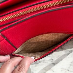 This Charming Charlie tote certainly lives up to its name, featuring red vegan leather with black glazing, 1 exterior zip pocket, 1 interior zip pocket, 2 interior slide pockets with cream colored logo lining, and a removable clochette encasing a gold tone ‘Charming Charlie’ logo on the strap.