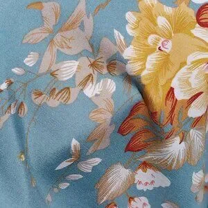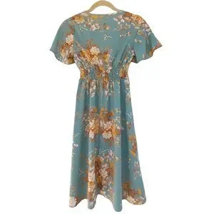 This floral print midi dress is light and airy with a beautiful, flowy look and feel. It is an A-Line style dress. The main color of this dress is aqua-like with more of a blue tint. The last 3 photos were taken outside in the bright sunshine, so that should give you a better idea of the true color. The flowers are white, yellow, and orange. This is a perfect dress for spring, summer, or early fall! It is extremely flattering, too!