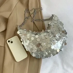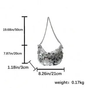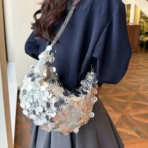 sequin sequins purse bag shoulder tote saddle party going out club dressy event occasion new years sparkle shiny medium silver contemporary maximalism accent accessory demure brat