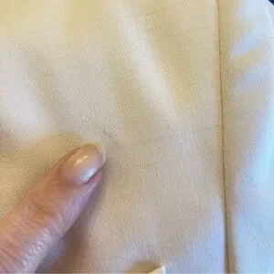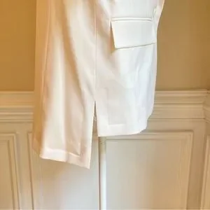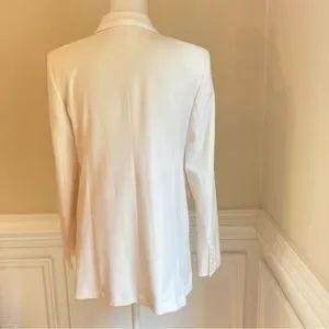 KARL LAGERFELD Cream White Wool Blend Blazer. White contrast on lapel & stitching. High low hem, boxier fit. Very good preowned condition with light mark at shoulder and few faint runs in fabric at shoulder. IT 46/small Bust 18.5”, waist 18”, length 24.75/27”✨Approx (J1)