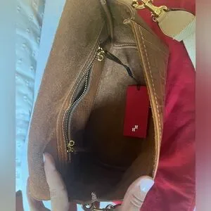 • Adjustable cross body strap Handcrafted contrasting stitching and edging.