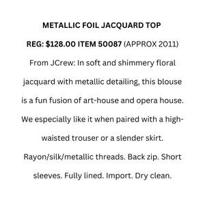 This stunning top features a mesmerizing metallic foil jacquard fabric that has dazzled for over a decade. Its timeless elegance and high-quality craftsmanship make it a standout piece from J.Crew. Note: Necklace not included.