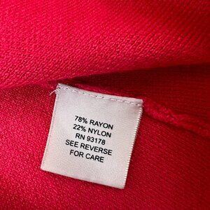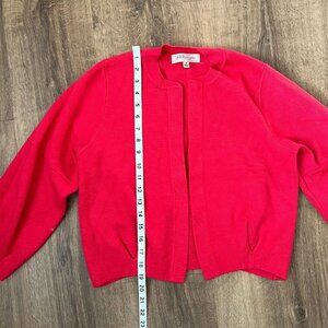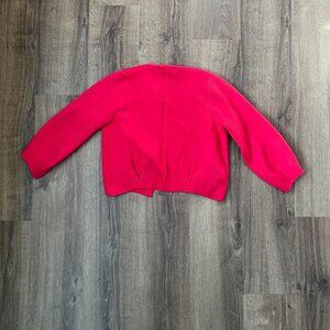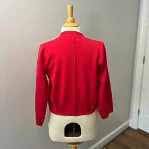 This is such a darling cardigan that is anything but average. Understated yet I absolutely adore the small design elements that make this a beautiful piece. Clean looking berry cardigan with nice lines but the true beauty is the small pin tuck pleats in the arms and around the waist that give this piece some high end style. It also has a really nice thicker weight to it that leans toward jacket. Smooth and not wrinkle prone like some cotton cardigans.