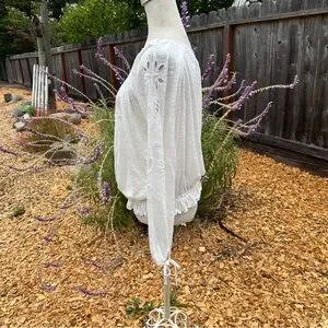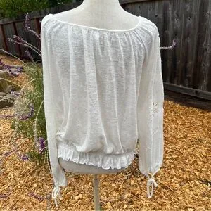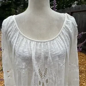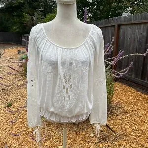 Free People Long Sleeve Ivory Cut Out Embroidered Top. Can be worn on or off the shoulder. Sleeves have ties at the wrists and a cute synched waist. Bohemian style.