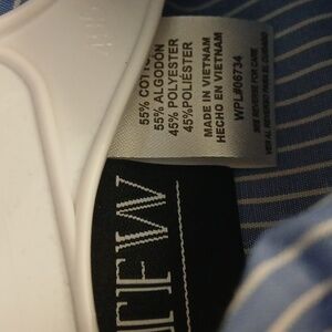 - Collared, button up shirt is medium blue and white striped.