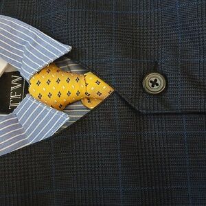 - Vest is blue plaid in the front and solid blue back.