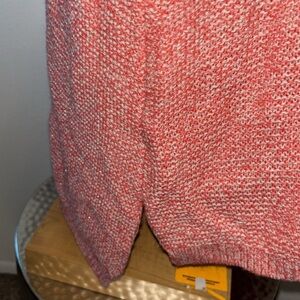 This is a super cute & new sweater! It has metallic threading throughout, but I can’t get it to show up in pictures. It has side slits and a cable knit front. It has lots of good stretch! Armpit to armpit is 29 inches and front length is 29 inches. The back length ay the longest is 34 inches.