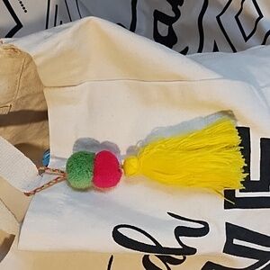 Tote bag with a bright pink, green, and yellow attached tassel. Perfect for school, church, or shopping. Sturdy.