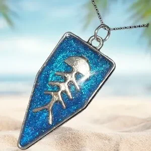 Necklace of from the sea. This is a silver tone fishbone in blue mica acrylic framed in silver tone .