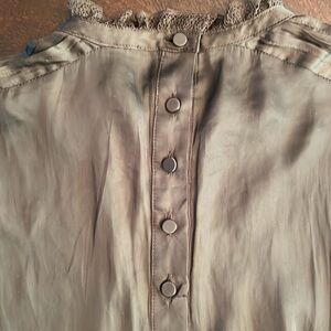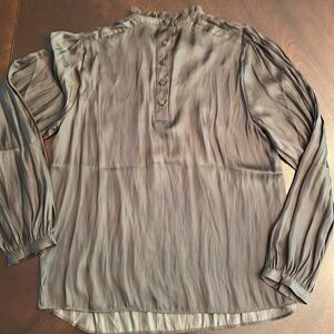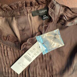 NWT J.Crew women’s ruffle lace trim neck drapery long sleeve top in dark brown polyester size xs. 5 buttons on back, button sleeve. Not sure how to press so never worn.