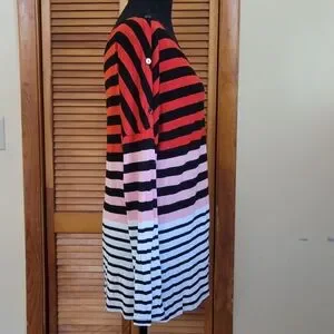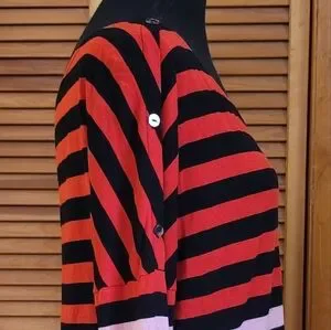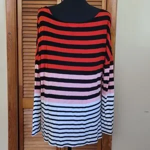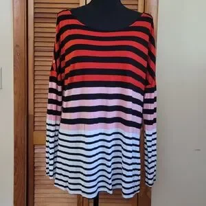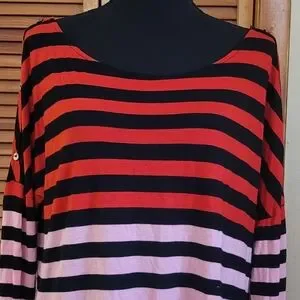 worn once, excellent condition, wide boatneck, faux button details on sleeves, ombre color, striped, 100% rayon