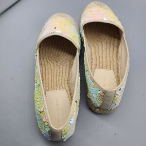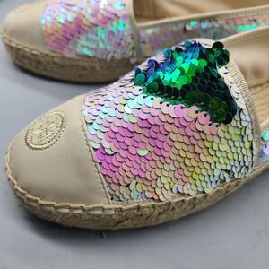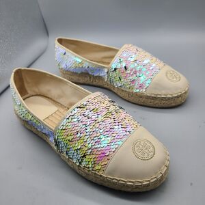 Tory Burch women flats sz 10 sequin espadrilles ivory green logo new