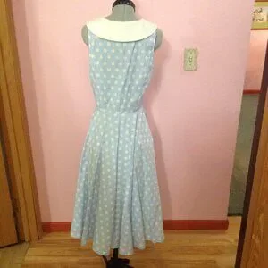Retro Blue Polka-Dot Sleeveless Dress with White Collar