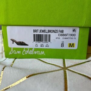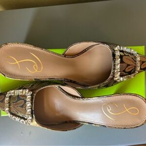 Sam Edelman mules dressy shimmery gold and bronze. Rhinestone buckle for added sparkle. Wear with dresses, skirts, or pants. See photos, and ask me anything.