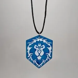 World of Warcraft Alliance themed logo necklace. 3D printed in clear blue resin and then painted. Comes on an adjustable-length nylon cord.
