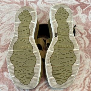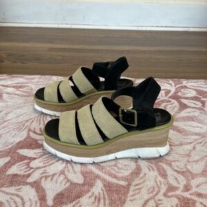 Super comfy platform sandals. Extremely padded footbed. Worn 3 times. Adjustable buckle strap. Lovely pale green colored suede look.