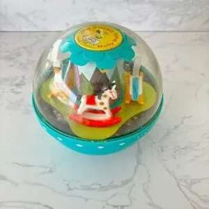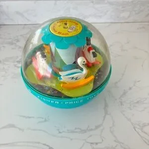 In very good vintage condition, this Fisher-Price chime ball makes pretty bells like sounds when pushed gently. See video. Colors are vibrant, and the four animals still rock back-and-forth. Chimes work perfectly. Smoke free pet free home.