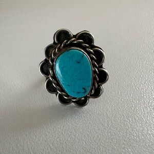 Low profile turquoise ring in the shape of a robin’s egg. Bezel set in a hammered silver and has an attractive scalloped edge. Unmarked metal description. Turquoise is not verified. This ring is non adjustable, although it may be sizable.