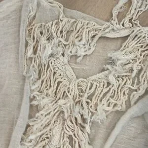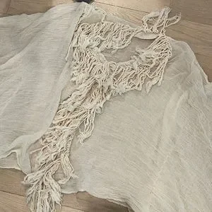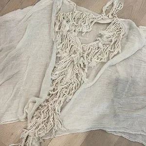 Beautiful fringe top from JPB. One size, could easily fit xL. Semi sheer due to the gauze fabric. I’m considering altering this piece but wanted to offer it for sale first