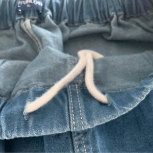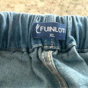 This is a NWOT pair of woman jean sports shorts. They are size XL. Elastic waist with interior pulls to fit to your desired feel. Has two pockets up front. The waist is all elastic.