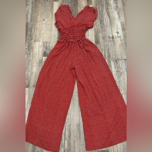 Max Edition wide leg jumpsuit. Red with white stripe and dot pattern. Sleeveless with ruffle trim around the shoulders and neckline. V-neck. Stretchy smocked bodice. Wide leg. Size M.
