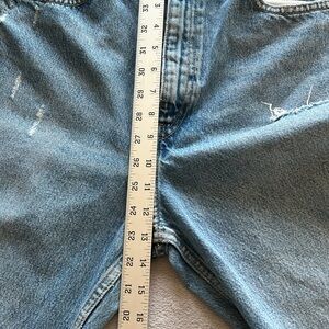 Rigid denim jeans by ZARA features a high waist with a straight leg cut. These jeans are a light blue wash with rips and distress. It’s a zip up button closure with 3 pockets in the front and 2 pockets in the back