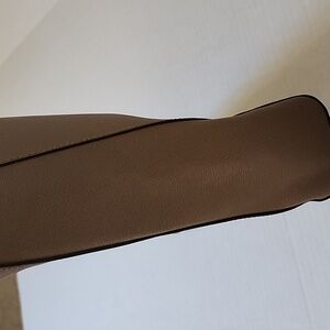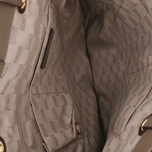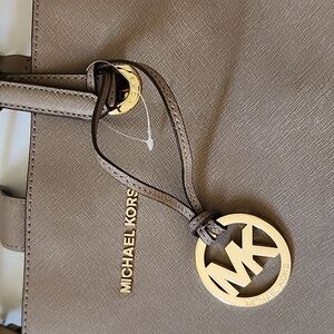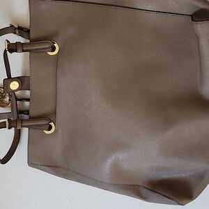 MICHAEL KORS Taupe Saffiano Leather Large Tote Shoulder Bag with gold hardware accents. Taupe Michael Korse signature lining and adjustable straps.