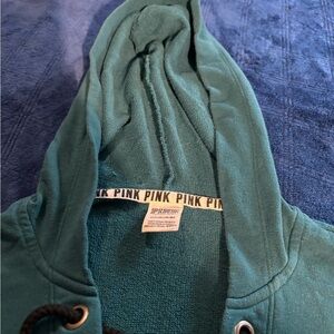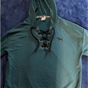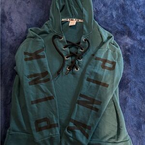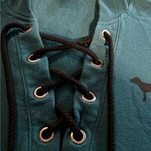 Juniors size S PINK oversized teal hoodie. This sweatshirt has a black string that crisscrosses over the chest. Logo dog is on the left chest and both arms have “PINK” written in black