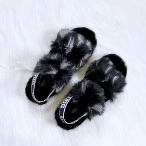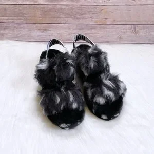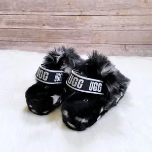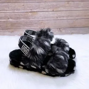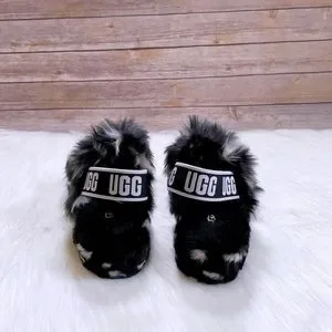 New In Box- UGG Women’s Oh Yeah Spots Slide Slipper Sandals In Black With Elastic Sling Back Straps With Graphic UGG Logo, Faux Shearling Uppers, Sheepskin Insoles, Faux Sheepskin Wrapped Midsoles And Molded Rubber Outsoles. Heel Hight 1.5”.