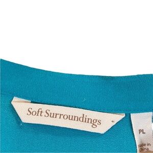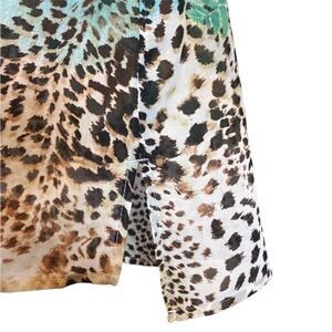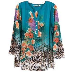 Soft Surroundings Sheer Floral and Animal Print Blouse size petite large, round neck with a v button top, long sleeves that can be rolled up, side slit on both sides, floral and leopard print, pleat in back,