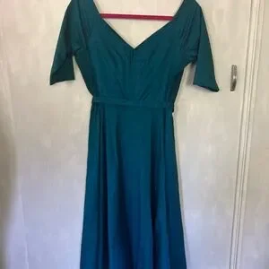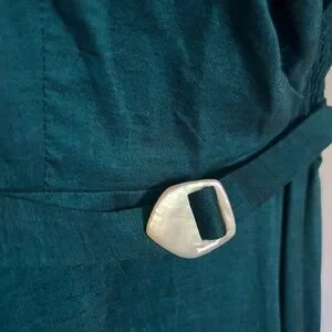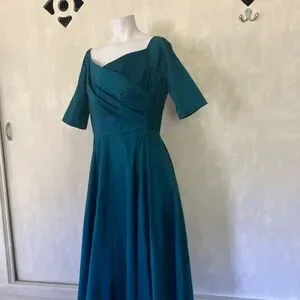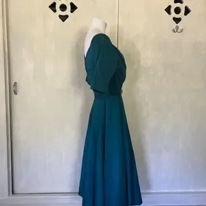 Amazing construction. I’m not sure if this is like the best handmade gown ever or it’s a very quality brand with no labels. It’s definitely raw silk with this super unique mother of pearl belt that’s so pretty. Elastic under arms at sides is such an ingenious way of making this fit like a glove but keeping the back more elegant. Would be great as a wedding guest or even mother of the bride dress. Great special occasion outfit but could also wear to a Christmas party or evening work function. Curvy figure flattering but not overtly sexy. Just really classic and classy. Lovely deep teal silk with all that lovely life that a more raw silk or dupioni silk weave has. . Gorgeous full skirt, could wear pretty off shoulder or with more princess neckline. Really high quality. I wish this fit :(