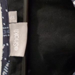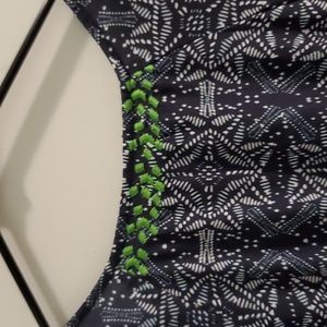 Very high waisted - gathers slightly below bust. Fits more like a medium. Navy blue and white print, green embroidery at neckline.