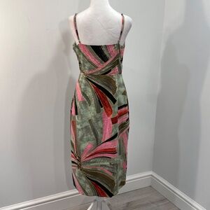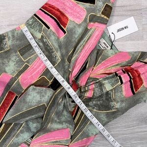 New with tags Jason Wu abstract print, linen blend, faux wrap midi dress. Olive green, pink and gold metallic. Side tie, front slit, adjustable shoulder straps, side zipper.