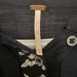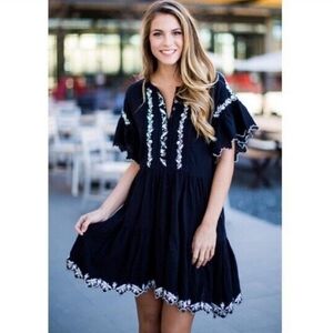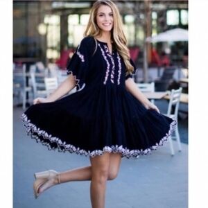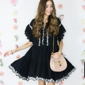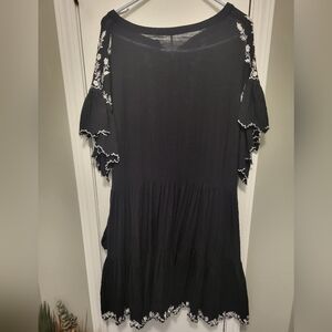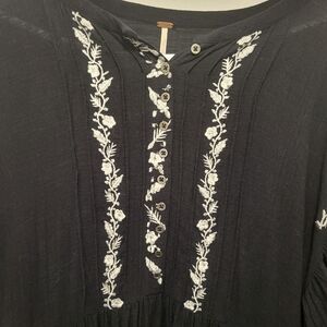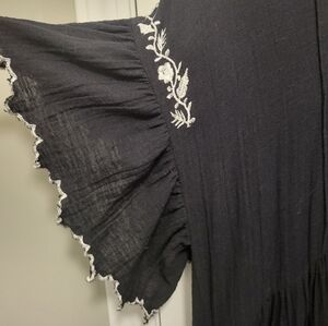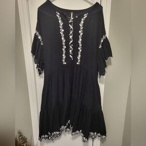 Euc Free People Black Cotton Mini Dress With White Embroidery. Front Button With Flared sleeves and Skirt. Has Pockets. 100% Cotton.