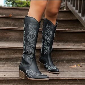 ✨ Chic Black Cowboy Boots Embroidered Cowgirl Boots Knee-High Western Boots