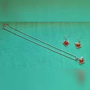 Sterling silver 18" necklace and earrings set, Southwest style, stones are believed to be Amber although not confirmed. Necklace and one earring is stamped "sterling" and have the makers mark. Fishhook style earrings are marked 925, see pictures. Beautiful vintage set!