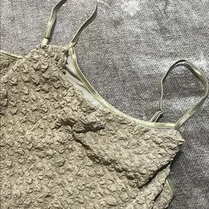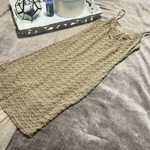 This elegant midi dress by Commense features a textured material in a light tan color with a stylish ruffled hem, creating a layered, flared effect. Draped neckline with spaghetti straps. Perfect for a cocktail party or night out, this dress is sure to make a statement.
